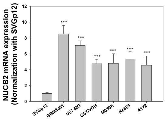 Real-time polymerase chain reaction was employed to analyze the expression levels of NUCB2 mRNA in both glial cells (SVGp12) and various types of GBM cells (GBM8401, U87-MG, G5T/VGH, M059K, Hs683, and A172). *** p < 0.001 compared with SVGp12 cells.