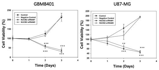 Cell viability was assessed using the MTT assay in GBM8401 and U87-MG cells across four groups: the control group, the negative control group, the si-NUCB2#1 group, and the si-NUCB2#2 group. ** p < 0.01 and *** p < 0.001 compared with control group.