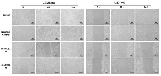 The cell migration capabilities were evaluated in GBM8401 and U87-MG cells using the wound healing assay across four groups: the control group, the negative control group, the si-NUCB2#1 group, and the si-NUCB2#2 group.