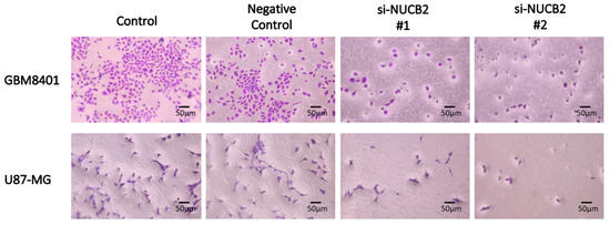 In vitro cell invasion assays were conducted using Transwell chambers (COR3452; CORNING, Corning, NY, USA). Cells were seeded at a density of 5 × 105 cells per insert, and the lower chamber of each Transwell was filled with 2 mL of medium containing either nonsense siRNA (negative control) or NUCB2 siRNA. Following a 24 h incubation, cells that remained on the upper surfaces of the Transwell membranes were removed using cotton swabs. Cells that had successfully invaded through the membranes to the bottom of the insert were fixed, stained, photographed, and quantified by counting the number of cells in six randomly selected high-powered fields.