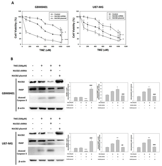 Effects of expression of NUCB2 on TMZ. (A) Cell viabilities of TMZ treatment combination between the control, NUCB2 shRNA, and NUCB2 plasmid groups in GBM8401 and U87-MG cells. (B) Protein levels of NUCB2, PARP, and cleaved caspase-3 as determined using Western blotting between the control, NUCB2 shRNA, and NUCB2 plasmid groups exposed to combined TMZ treatment in GBM8401 and U87-MG cells. * p < 0.05, ** p < 0.01 and *** p < 0.001 compared with TMZ only group. ## p < 0.01 and ### p < 0.001 compared with TMZ plus NUCB2 shRNA group.