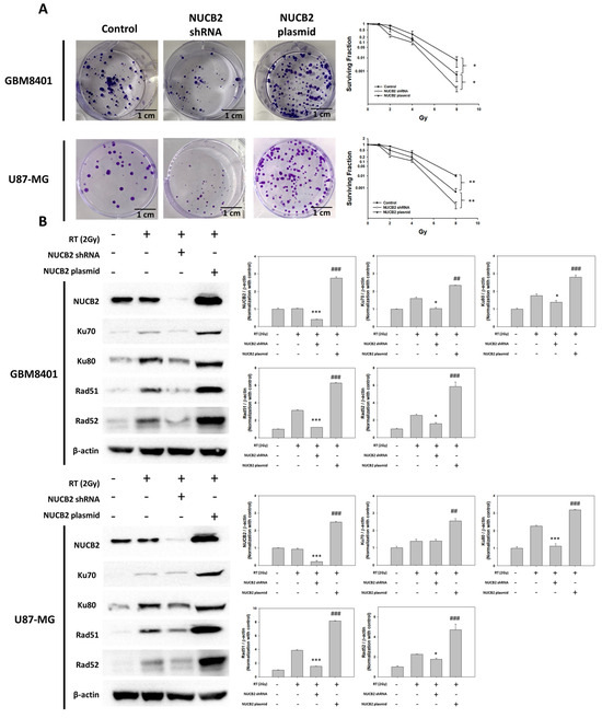 To investigate the role of NUCB2 in radioresistance, GBM8401 and U87-MG cells transfected with shRNA or plasmid were treated with a single dose of 2Gy radiation. Colony formation assay was performed to evaluate cell survival. The results showed that the NUCB2 plasmid group had more colony formation than the control group, whereas the NUCB2 shRNA group exhibited fewer colonies (Figure 8A). After radiation, DNA damage occurs, and DNA repair activities are activated. Western blot analysis revealed that the NUCB2 plasmid group had higher protein levels of DNA repair-related proteins (Ku70, Ku80, Rad51, and Rad52) than the control group. Conversely, the NUCB2 shRNA group exhibited lower protein levels of these DNA repair proteins (Figure 8B).