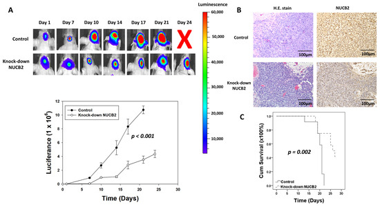 To investigate the impact of NUCB2 on tumorigenesis in vivo, an animal model with intracranial tumor implantation was used. GBM8401 cells transfected with luciferase gene and NUCB2 knockdown by shRNA were implanted into the brains of the animals. Tumor size was evaluated using IVIS imaging after tumor implantation. The level of luciferase detected in the NUCB2 knockdown group was significantly reduced compared to that in the control group (Figure 9A). On day 21 after tumor implantation, the intracranial tumors were removed, and immunohistochemical staining for NUCB2 expression was performed. The NUCB2 knockdown group showed less NUCB2 expression. Furthermore, the NUCB2 knockdown group exhibited significantly prolonged survival compared to the control group (Figure 9B).