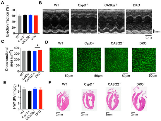 | Echocardiography Parameters | CypD−/− | CASQ2−/− | DKO | WT |