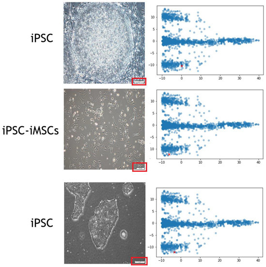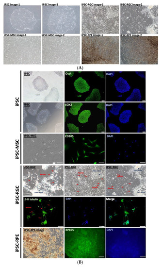 iPSCs were seeded on the dishes pre-coated with Geltrex™ matrix (#A1413301; Thermo Fisher Scientific, Waltham, MA, USA) dissolved in DMEM/F-12 (#10565-018; Thermo Fisher Scientific) and maintained in StemFlex™ medium (#A3349401; Thermo Fisher Scientific, Waltham, MA, USA) in a humidified incubator at 37 °C and 5% CO2. iPSCs were subcultured by dissociation in Versene solution (#15040066; Thermo Fisher Scientific, Waltham, MA, USA) and re-seeding in StemFlex medium. The induction of iPSC-MSC differentiation was conducted following the methods described by Hynes et al. [27]. Briefly, undifferentiated iPSCs without mouse embryonic fibroblast feeders were dissociated with a cell scraper and washed using the MSC wash medium containing MEM α-based medium supplemented with 5% fetal bovine serum, 50 U/mL penicillin, and 50 μg/mL streptomycin. The wash medium with feeder-free iPSC suspension was centrifuged at 400× g for 5 min at 4 °C, and then the supernatant was removed. Subsequently, these iPSC colonies were resuspended in MSC culture medium consisting of MEM α-based medium supplemented with 10% fetal bovine serum, 2 mM L-glutamine, 1 mM sodium pyruvate, 50 U/mL penicillin, and 50 μg/mL streptomycin, non-essential amino acids (NEAA), and HEPES solution. The medium was changed every 3 to 4 days, and iPSC colonies were differentiated into a mixture of heterogenous cell types after a 2-week differentiation time course. The serial passaging was used to select MSC-like cells which were more homogenous and exhibited pronounced fibroblast morphology. For the differentiation of iPSCs into iPSC-RPEs and iPSC-RGCs, the differentiation following the procedures reported by Regent et al. [28], Yang et al. [8] and the protocols for the routine generation of iPSC-RGCs in our laboratory [9,10] were used, respectively.