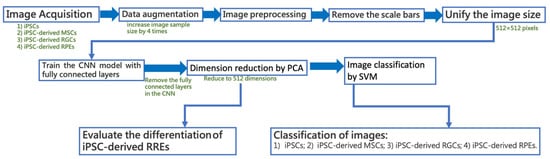 Briefly, the training of these algorithms for image recognition was conducted as summarized in Figure 2. Overall 1937 images of iPSCs and other differentiated cells were enrolled; including 401 images of iPSCs, 565 images of iPSC-MSCs, 370 images of iPSC-RPEs, and 601 images of iPSC-RGCs. The image file formats were either JPG or TIFF. The magnification of these images was between 10 and 20X. Prior to the training of the CNN, the image dataset was split the training (1291 images) and test (647 images) subsets. The images of the training subset were subjected to data augmentation, which involved horizontal flip, vertical flip, and horizontal and vertical flip combined, resulting in 5164 images in the training subset. 20% (1032 images) of the augmented data were selected as the validation subset. The data in the test subset were not augmented. After the data augmentation, the number of images of iPSCs increased from 401 to 1604, the number of images of iPSC-MSCs increased from 565 to 2260, the number of images of iPSC-RGCs increased from 602 images to 2408, and the number of iPSC-RPE images increased from 370 to 1480. Images were preprocessed to unify their size. To avoid incorrect feature extraction, the scale bars in all figures were removed. Subsequently, we trained the CNN networks which consisted of fully connected layers. After removing the fully connected layers, the PCA was used to reduce the number of dimensions of image deep feature extraction. After the feature projection, SVM was used to classify the pooled images in the validation set into four categories: iPSCs, iPSC-MSCs, iPSC-RGCs, and iPSC-RPEs. The maximal variance between iPSC images and the images to be tested was used to distinguish the features among these four categories. For iPSC-RPEs, the projected distances between iPSC-RPEs and iPSCs were used to evaluate their differentiation degree.