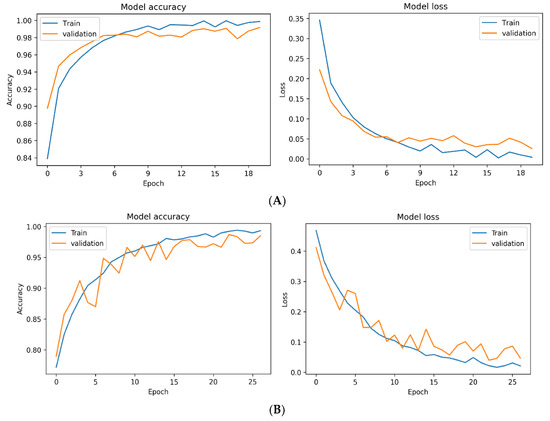 We recorded the values of the training process and used Python’s matplotlib library to plot the line charts of model accuracy and model loss. We found that the model exhibited a batch training set accuracy higher than 80% in the first epoch of training, and a steady decline of the loss function (Figure 6A). In addition, when the features were scaled to a range between 0 and 1 instead of −1 to 1 with an average of zero during preprocessing, the training process was relatively unstable with relatively slow training speed (Figure 6B). At the first epoch, the accuracy of the training set was only 80%, significantly less than the previous model trained with an average of zero.