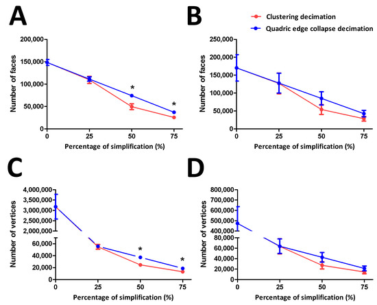 Number of faces and vertices of FtMt and LC3 3D models before and after the simplification procedure. (A). Number of faces of FtMt 3D models before and after 25%, 50%, and 75% simplification through CD and QECD. There was a significant decrease in the number of faces undergoing CD at 50% and 75% simplification compared to QECD. (B). Number of faces of LC3 3D models before and after 25%, 50%, and 75% simplification through CD and QECD. There was no significant difference in the number of faces undergoing CD at 25%, 50% and 75% simplification compared to QECD. (C). Number of vertices of FtMt 3D models before and after 25%, 50%, and 75% simplification through CD and QECD. There was a significant decrease in the number of faces undergoing CD at 50% and 75% simplification compared to QECD. (D). Number of vertices of LC3 3D models before and after 25%, 50%, and 75% simplification through CD and QECD. There was no significant difference in the number of vertices undergoing CD at 25%, 50%, and 75% simplification compared to QECD. 0% indicate the original number of faces and vertices, respectively. * demonstrates a statistically significant difference (p < 0.05) between CD and QECD at a particular simplification percentage. Data are presented as the mean ± standard deviation (SD).