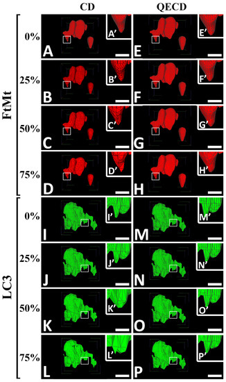 The shape of the FtMt and LC3 3D models before and after the simplification procedure. (A–H). The shape of the FtMt model at 0%, 25%, 50%, and 75% of CD and QECD simplification, respectively. (A’–H’). High-magnification image of the boxed area in (A–H), respectively. There was no notable change in the shape after undergoing 25% simplification through the CD and QECD. However, the shape was slightly changed with CD at 50% and 75% simplification. On the other hand, there was no noticeable change in the shape with QECD at 50% and 75% simplification. (I–P). The shape of the LC3 model at 0%, 25%, 50%, and 75% of CD and QECD simplification, respectively. (I’–P’). High-magnification image of the boxed area in (I–P), respectively. There was no notable change in the shape after undergoing 25% simplification through the CD and QECD. However, the shape was slightly altered with CD at 50% and 75% simplification. On the other hand, the shape did not change significantly with QECD at 50% and 75% simplification. All scale bars: 0.5 µm.