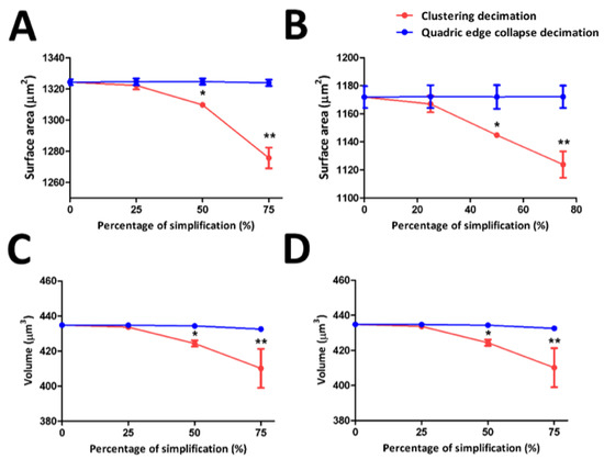The surface area and volume of FtMt and LC3 3D models before and after simplification. (A,B). Surface area of FtMt and LC3 3D models before and after 25%, 50%, and 75% simplification through CD and QECD, respectively. There were no significant changes in the surface area of the FtMt model at 25% simplification through CD compared to the original model. However, there were significant changes in the volume of the model at 50% and 75% simplification compared to the initial volume of the FtMt and LC3 models, respectively. (C,D). Volume of the FtMt and LC3 3D models before and following 25%, 50%, and 75% simplification by CD and QECD, respectively. Comparing the FtMt model with a 25% simplification through CD to the original model, there were no significant changes in surface area. Nonetheless, the volume of the model at 50% and 75% simplification differed significantly from the initial volume of the FtMt and LC3 models, respectively. 0% indicates the original number of faces and vertices, respectively. * indicates a significant difference (p < 0.05) at 50% simplification compared to the initial rendered model (0%). ** indicates a significant difference (p < 0.05) at 75% simplification compared to the initial rendered model (0%). Data are presented as the mean ± standard deviation (SD).