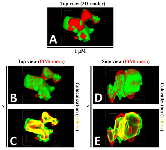 A shader was applied to facilitate the presentation of colocalized meshes in a rendered 3D model. Various shaders were accessible in the MeshLab, but subsequently, the X-ray shader was found to be the most appropriate approach for our observation. Here, an X-ray shader was applied to the FtMt and LC3 colocalization model and demonstrated, respectively (Figure 5A–E). In the absence of a shader, the spatial localization of each mesh was unable to be presented appropriately, which affected the precise presentation of the colocalization (Figure 5A,B,D). However, with the X-ray shader, the opacity of the meshes could be adjusted, and colocalization between both meshes could be observed and presented (Figure 5C,E).
