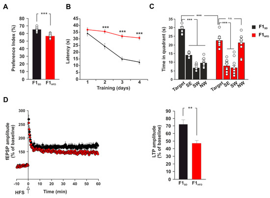 Moreover, 3xTg-AD animals derived from overfed mothers took longer time to reach the hidden platform during the training phase of MWM test (34.9 ± 0.8 vs. 24.5 ± 1.5 s for day 2; 32.1 ± 1.1 vs. 15.1 ± 1.7 s for day 3; 30.1 ± 1.1 vs. 12.7 ± 1.6 s for day 4; n = 10; p < 0.001 for each day; Figure 1B). Accordingly, they also spent less time than controls in the target quadrant and did not distinguish the target quadrant from all other ones during the probe test (time in the target quadrant: 22.9 ± 1.2 vs. 29.1 ± 0.7 s, p = 1.37 × 10−4; time in the four quadrants: North–East (NE) vs. North–West (NW), p = 0.489 for F1HFD 3xTg-AD mice; n = 10; Figure 1C). Therefore, the analysis of long-term potentiation (LTP) at the CA3–CA1 hippocampal synapses in brain slices derived from F1SD and F1HFD 3xTg-AD mice revealed a significant deficit of synaptic plasticity in the offspring of overfed mothers (field excitatory postsynaptic potential (fEPSP) amplitude potentiation: 47.4 ± 4.7% vs. 71.8 ± 7.1%, p = 0.0015; n = 10 for F1HFD and n = 11 for F1SD; Figure 1D). Collectively, our in vivo and ex vivo experiments indicated that metabolic stress occurring in the early phase of brain development accelerated the impairment of synaptic plasticity, learning and memory in 3xTg-AD mice and anticipated the onset of AD-like phenotype.