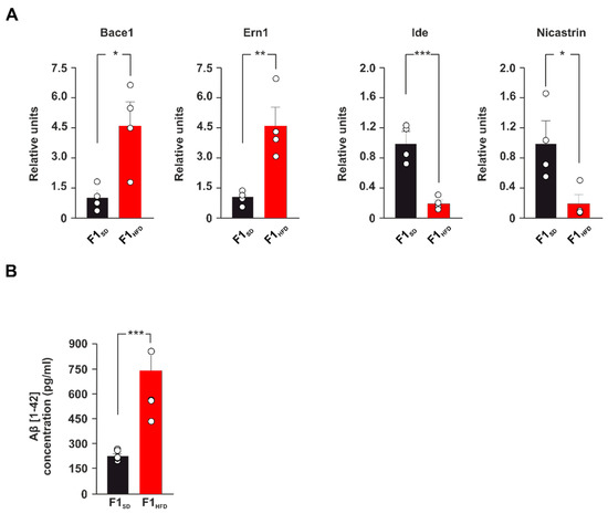 To gain insight into the mechanisms underlying the worsening of the AD phenotype in the 3xTg-AD mice born to HFD mothers, we studied the expression of a pattern of AD-related genes in hippocampal lysates of F1SD and F1HFD 3xTg-AD animals. Real-time PCR array revealed either upregulation or downregulation of several genes potentially regulating the development of neurodegeneration in the offspring of overfed mothers (Supplementary Table S1). In particular, the expression of genes coding for the enzymes BACE1, IRE1 (i.e., Ern1), IDE and Nicastrin, which control Aβ metabolism, was altered in the hippocampus of F1HFD 3xTg-AD mice compared to controls (fold change: +4.76 for Bace1, p = 0.0158; +4.57 for Ern1, p = 0.0059; −4.95 for Ide, p = 0.0009; −5.16 for Nicastrin, p = 0.0235; n = 4; Figure 2A).