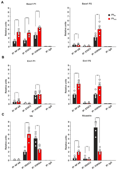 In addition, both increased recruitment of NF-kB and elevated levels of histone acetylation were also evident on the promoter of Ern1 gene by chromatin immunoprecipitation (ChIP) experiments (P2: +115.8% for NF-kB, p = 4.75 × 10−5; +87.3% for H3K9ac, p = 0.0091; n = 6; Figure 4B). Conversely, the regulatory sequences of downregulated Ide and Nicastrin showed enhanced binding of epigenetic repressor histone deacetylase 2 (HDAC2) and reduced levels of H3K9ac in the hippocampi of HFD offspring (Ide: +203.4% for HDAC2, p = 5.26 × 10−5, −49.9% for H3K9ac, p = 0.0013; Nicastrin: −72.7% for H3K9ac, p = 6.85 × 10−6; n = 6; Figure 4C), indicating that epigenetic derangement of AD-related gene promoters may be involved in the maternal HFD-dependent worsening of AD phenotype. No binding was detected for transcription factor NF-kB on the promoter of Ide, whereas higher recruitment occurred on the promoter of Nicastrin in the hippocampi of mice derived from overfed mothers (+310.2% for F1HFD 3xTg-AD mice, p = 0.0003; n = 6; Figure 4B). Collectively, our results reveal that maternal overnutrition can accelerate AD progression in 3xTg-AD mice via dysregulation of NF-kB, STAT3 and HDAC2 recruitment on the regulatory sequences of genes regulating APP metabolism.