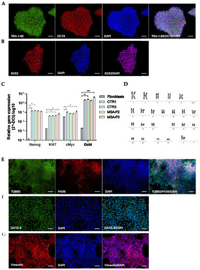 Additional iPSC lines from two MSA-P patients (probable diagnosis using Gilman criteria [1]) and two age- and sex-matched healthy controls (Table 1) were generated for the molecular and functional analyses. The successful reprogramming was confirmed using multiple assays. All four generated iPSC lines expressed the pluripotency markers octamer-binding transcription factor (OCT) 4, sex-determining region Y-box (SOX) 2, and podocalyxin (TRA-1-60), as shown by the immunochemical stainings (Figure 1A,B). The quantitative real-time PCR (qRT-PCR) results demonstrated significantly elevated gene expression of the pluripotency markers when compared to their origin fibroblast cell type (Figure 1C). The directed differentiation into each of the three germ layers (mesoderm, endoderm, and ectoderm) resulted in the cells expressing vimentin and GATA binding protein 4 (GATA-4), as well as paired box protein Pax-6 (PAX6) and β-tubulin III (TUBB3), respectively (Figure 1E–G). The euploidy of the generated iPSC lines was confirmed using single nucleotide polymorphism array-based karyotyping. A representative image of the karyotype of the iPSC line MSA-P3 is shown in Figure 1D.