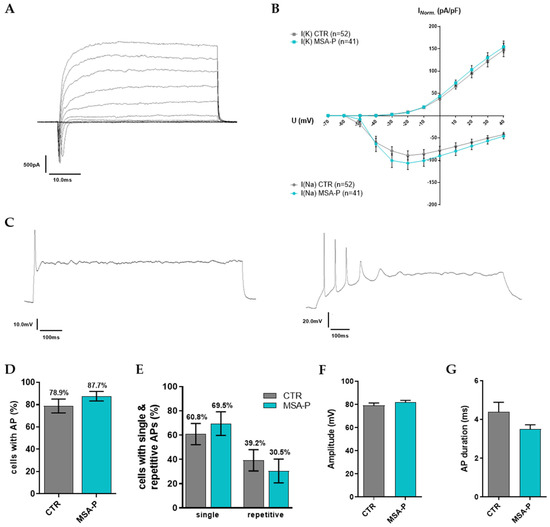 Voltage-gated ion currents, as well as elicited action potentials (APs), of the MSNs derived from the MSA-P patients and healthy controls at day 70 (±3 days) of differentiation. (A) Sodium inward and potassium outward currents of MSA-P MSN after maturation for 70 days were recorded in whole-cell voltage-clamp mode via depolarizing steps in increments of 10 mV from a holding potential of −70 mV to +40 mV. (B) IV-plot indicating that the ion current amplitudes (normalized for individual cell sizes based on the capacitances of the cell membrane (pA/pF)) were not significantly different between MSA-P MSNs (n = 41) and the controls (n = 52, two-way ANOVA with Bonferroni post hoc test). (C) Examples of MSA-P MSNs spiking single and repetitive APs upon depolarization from holding potentials of −60 mV to −70 mV. (D) The percentages of the neurons firing APs during depolarizations were not significantly different between the MSA-P MSNs and the controls (nonparametric Mann–Whitney test). (E) The percentages of neurons with single or repetitive (2, 3, 4, ≥ 5) APs were comparable between the MSNs of both groups (nonparametric Mann–Whitney test). (F) AP peak amplitude and (G) duration were not significantly different between MSA-P (n = 35) and the control MSNs (n = 44, unpaired t-test or nonparametric Mann–Whitney test). Data were analyzed from three healthy control and MSA-P cell lines after at least three independent differentiations and are presented as means ± SEM.