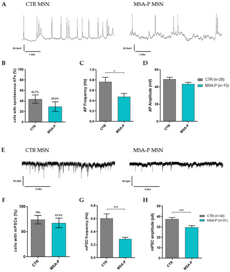Spontaneous action potentials (APs) and synaptic activity of MSNs from MSA-P patients and healthy controls at day 70 (±3 days) of differentiation. (A) Representative traces of spontaneous APs from both groups. (B) Percentage of neurons with spontaneous APs was similar for MSA-P and control MSNs. (C) The frequency of spontaneous APs was significantly reduced in the MSNs from the MSA patients compared with the MSNs from healthy controls (p = 0.0291, nonparametric Mann–Whitney test), whereas the amplitudes did not differ between the groups (D). (E) Representative traces of the mPSCs from MSA-P and the control MSNs. (F) Similar to the spontaneous APs, the percentage of neurons showing miniature postsynaptic currents (mPSCs) as synaptic activity was not significantly different between MSA-P and the control MSNs. (G) However, the frequency, as well as (H) the amplitude, of the mPSCs were significantly reduced in the MSA-P MSNs when compared to the control MSNs (p = 0.0007 and p < 0.0001, nonparametric Mann–Whitney test). Data from three control and MSA-P lines from at least three independent differentiations were analyzed. * p < 0.05, *** p < 0.001. Data are presented as means ± SEM.