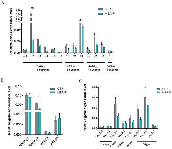 The genomic expression levels of the voltage-gated Ca2+ channel subtypes, which are downstream and are also involved in the GABAB receptor-associated release of α-synuclein [26], tended to be reduced but did not significantly differ in MSA-P when compared to the control MSNs (Figure 6C), suggesting that these channels do not contribute markedly to the α-synuclein pathology in MSA-P.