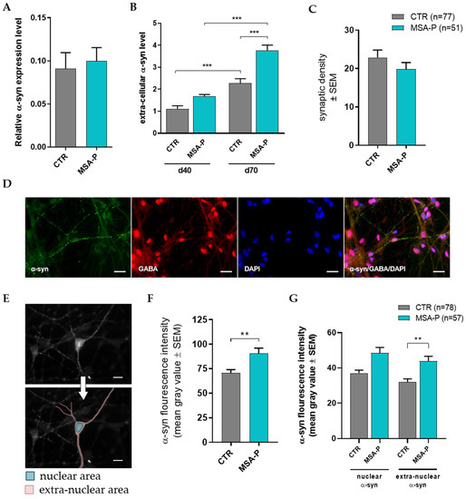 α-Synuclein (α-syn) characteristics in the MSNs of three MSA-P patients and three healthy controls. (A) Relative gene expression of α-synuclein in mature MSNs was similar for MSA-P and the control cell lines at day 70 (±3 days) of differentiation. (B) The release of α-synuclein into the medium, as observed using dot blot analysis, was significantly (p < 0.001) elevated in the mature (d70) MSA-P MSNs when compared to the immature (d40) MSA-P MSNs and the mature control MSNs. Additionally, the mature control MSNs revealed higher α-synuclein release than the immature control MSNs. Data are presented as means ± SEM. Data were subjected to one-way ANOVA, followed by Bonferroni’s multiple comparisons post hoc test. At day 40 (±4 days) and at day 70 (± 4 days), conditioned medium was used. (C) No significant difference in the number of GABAergic synapses in MSA-P and the control MSNs at day 70 (±3 days) of differentiation was observed in morphometric analysis. (D) The distribution of α-synuclein within the MSNs was quantified via immunocytochemistry. Representative images of the mature MSNs of the cell line MSA-P3 at day 70 (±3 days) of differentiation, showing the distribution of α-synuclein in GABA-positive neurons. Scale bars indicate 25 µm. (E) Representative image of α-synuclein staining and tracing of what is considered the nuclear area (blue) and the extranuclear area (red). Scale bars indicate 20 µm. (F) Quantitative morphometric analysis revealed a significantly higher amount of α-synuclein in the MSA-P MSNs compared to the control MSNs (p = 0.0029, nonparametric Mann–Whitney test). (G) The supply of extranuclear α-synuclein was significantly (p = 0.002) elevated in the MSA-P MSNs, whereas the difference in nuclear α-synuclein did not quite reach a significant difference. Data are presented as means ± SEM. Data were subjected to Kruskal–Wallis testing, followed by Dunn‘s multiple comparisons post hoc test. ** p < 0.01, *** p < 0.001.