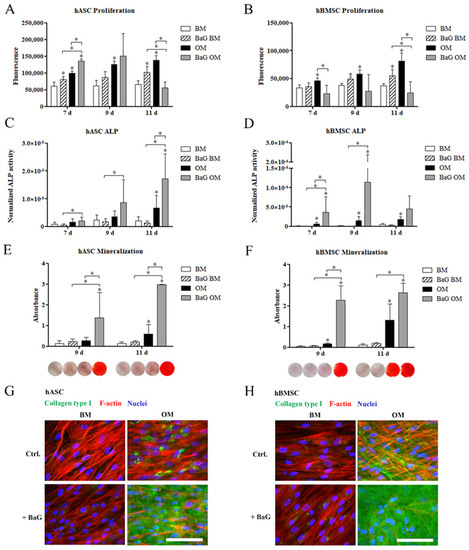 Mineral accumulation in the extracellular matrix (ECM), characteristic of late osteogenic differentiation, was analyzed by Alizarin Red (AR) staining of hASCs and hBMSCs, after 9 and 11 days of osteogenic differentiation (Figure 1E,F). Based on the quantitative AR staining and corresponding qualitative images shown below the columns, BaG OM significantly enhanced matrix mineralization of both hASCs and hBMSCs. OM alone induced mineralization compared with the BM control, but the level of mineral accumulation was markedly lower without BaG. Only hBMSCs demonstrated strong red AR staining in OM, on day 11. BaG without osteogenic supplements could not stimulate mineralization of the ECM during the culture period.