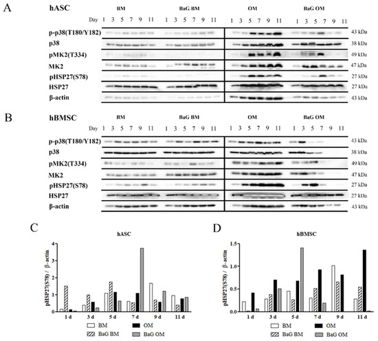 Timeline of p38/MK2/HSP27 activation in hASCs and hBMSCs. (A,B) hASCs and hBMSCs were cultured in BM, BaG BM, OM, and BaG OM for 1, 3, 5, 7, 9, and 11 days, and analyzed with Western Blotting and immunodetection. The figure presents cropped blots of p-p38, p38, pMK2, MK2, pHSP27(S78), HSP27, and β-actin of the representative donor cell lines. Full-length blots are presented in Figure S4. (C,D) Semi-quantification of the pHSP27(S28) bands presented normalized to β-actin in hASCs and hBMSCs. Abbreviations basic medium, BM; osteogenic medium, OM; and bioactive glass, BaG.