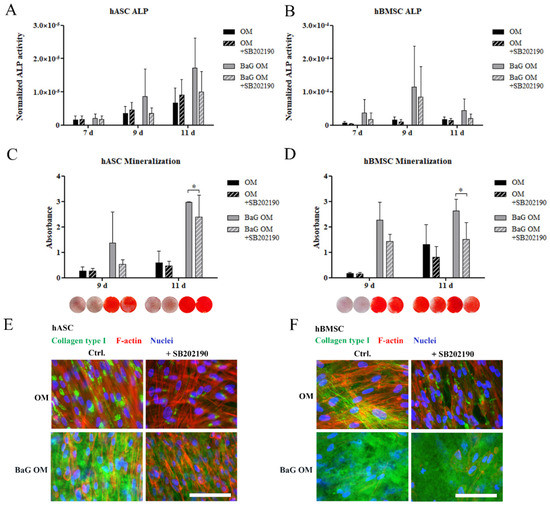 The effect of p38 MAPK inhibition with SB202190 on hASC and hBMSC osteogenesis. hASCs and hBMSCs were cultured in BM, BaG BM, OM, and BaG OM supplemented with 3 µM SB202190 inhibitor. (A,B) Early osteogenic differentiation was assessed with ALP activity. (C,D) Matrix mineralization was analyzed with Alizarin Red staining (stained wells, area 1.9 cm2). (E,F) ICC staining of collagen type I. Scale bars are 100 µm. Values for OM and BaG OM conditions without the inhibitor, and qualitative representative results of Alizarin Red staining are the same as presented in Figure 1. Statistical analysis: ALP analysis (and cell proliferation used to normalize the ALP activity data); N = 9, independent biological replicates of three donors of each cell type. Mineralization; hASCs: N = 9 independent biological replicates of three donors; hBMSCs: N = 6 independent biological replicates of two donors. Statistical analysis was conducted within the time point, and comparisons were made between OM and OM + SB202190 or BaG OM and BAG OM + SB202190. * p ˂ 0.05. Abbreviations: osteogenic medium, OM; and bioactive glass, BaG.