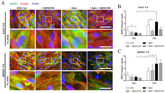 Statistical analyses were performed to evaluate the differences between samples in the ALP, CyQUANT, and Alizarin Red analyses, and the image-based quantitation data of HSP27, pHSP27, and F-actin. Results are expressed as mean and standard deviation (SD). Statistical analyses were conducted using the non-parametric Mann–Whitney test, followed by the Bonferroni post-hoc test with GraphPad Prism 5 (La Jolla, CA, USA). Statistical differences with p ˂ 0.05 were considered significant. BM BaG, OM, and OM BaG conditions were compared to BM control. Comparisons of BM BaG vs OM BaG, OM vs OM BaG, and the comparisons between BM, BaG BM, OM, and BaG OM, and the corresponding SB202190-inhibited conditions were also made due to their relevance.