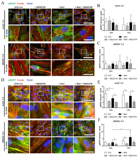 Cellular localization of phosphorylated HSP27 in hASCs and hBMSCs. (A,D) Representative images of pHSP28(S78) stained hASCs and hBMSCs, after 3 and 9 days of culture in OM and BaG OM. Fluorescence images were taken with a 40 X magnification and with filters for pHSP27(S78) (Alexa 488, green), actin (Alexa 546, red), and nuclei (DAPI, blue). The 4 X digital zoom images are presented below the corresponding original images, indicated with white rectangles. Secondary antibody controls are presented in Figure S2b. Scale bars are 100 µm in the original images and 25 µm in the zoom images. (B,C,E,F) Image-based quantification of mean grey values of pHSP27 stained hASCs and hBMSCs normalized with nuclei count. Statistical analysis: hASCs: N = 6–9 (3 d)/8–10 (9 d) images, 2 independent biological replicates of 2 donors; hBMSCs: N = 7–9 (3 d)/7–11 (9 d) images, 2 independent biological replicates of 2 donors. Representative images of hASCs and hBMSCs cultured in BM and BaG BM conditions are in Figure S6b,c. * p ˂ 0.05. The asterisk above the error bar indicates the statistical difference compared to the BM control, and other comparisons are indicated with lines. Abbreviations: basic medium, BM; osteogenic medium, OM; and bioactive glass, BaG.