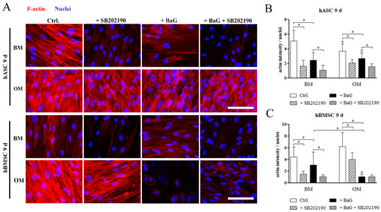 Actin cytoskeleton and F-actin intensity of hASCs and hBMSCs. (A) Representative Phalloidin-TRITC stained hASCs and hBMSCs cultured 9 days in BM, BaG BM, OM, and BaG OM supplemented with 3 µM SB202190 inhibitor. The cells were imaged with a fluorescence microscope using constant exposure times with Alexa 546 for actin (red) and DAPI (blue) filters, and a 40× magnification. Scale bar is 100 µm, and is used in every image. (B,C) Image-based quantification of mean grey values of Phalloidin-TRITC stained hASCs and hBMSCs normalized with nuclei count. Statistical analysis: hASCs: N = 16–18 images, 4 independent biological replicates of 2 donors; hBMSCs: N = 15–18 images, 4 independent biological replicates of 2 donors. * p ˂ 0.05. The asterisk above the error bar indicates the statistical difference compared to the BM control, and other comparisons are indicated with lines. Abbreviations: basic medium, BM; osteogenic medium, OM; and bioactive glass, BaG.