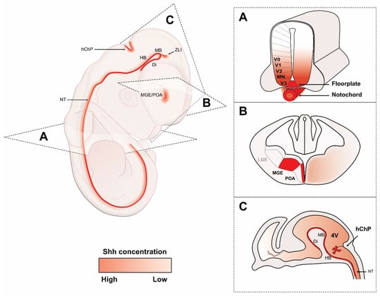 Historically, the first Shh sources identified during vertebrate development are the floor plate, the notochord, and the zone of polarizing activity (ZPA) at the posterior side of the developing limb [31,32]. Here, we focus on the nervous system, and we will not address the ZPA but advise readers to explore other very detailed reviews on the subject [14].