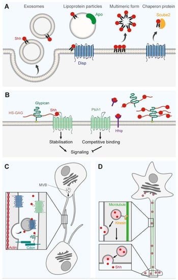 - Herrera, E.; Sitko, A.A.; Bovolenta, P. Shh-Ushing Midline Crossing through Remote Protein Transport. Neuron 2018, 97, 256–258. [Google Scholar] [CrossRef]