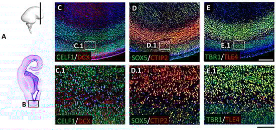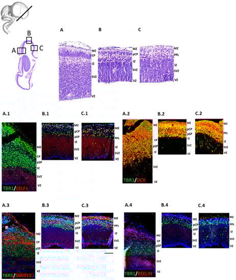 - Hevner, R.F. Layer-Specific Markers as Probes for Neuron Type Identity in Human Neocortex and Malformations of Cortical Development. J. Neuropathol. Exp. Neurol. 2007, 66, 101–109. [Google Scholar] [CrossRef]