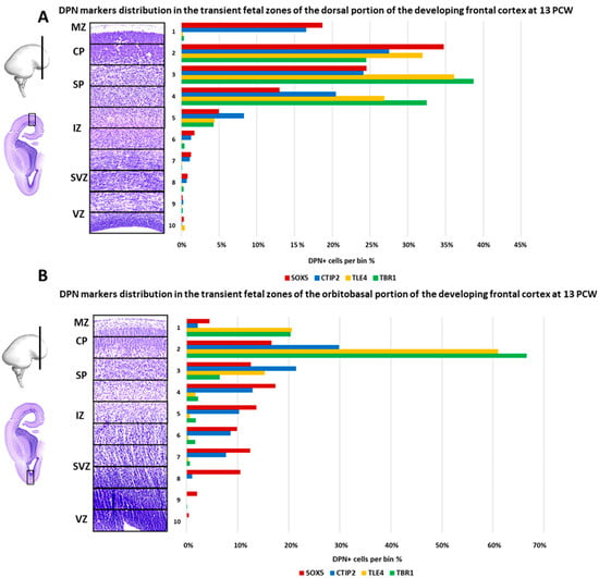 Laminar distribution of DPN markers in the dorsal and basal portion of the frontal cortex in the developing human brain during the SP formation period at 13 PCW. Cells were counted on the IF-stained dorsal (A) and basal (B) portions of the frontal cortex (coronal sections). The quantification columns were divided into ten bins, delineated according to the adjacent Nissl sections. Quantitative data obtained by cell counting is presented as a percentage of DPN marker (SOX5, CTIP2, TLE4, TBR1) positive cells in the cortical compartments. DPN markers are predominantly expressed in bins 2, 3, and 4, corresponding to the deep CP and the SP compartments.