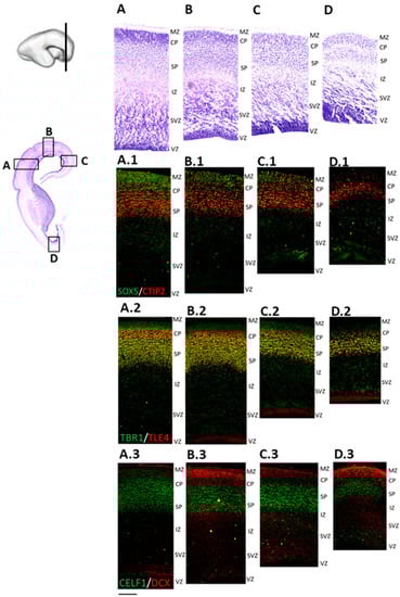 Establishment of the typical fetal lamination during the mid-fetal period (15 PCW). Magnified regional portions of the Nissl coronal section show a cytoarchitectonic overview of the typical fetal lamination (A–D). IF-stained sections show regional and laminar dynamics of DPN markers expression (A.1–D.3). Expanded SP shows TBR1 reactivity throughout the whole thickness (A.2–D.2). SPN are labeled with deep-projection neuron markers TLE4 (A.2–D.2), SOX5, and CTIP2 (A.1–D.1), as well as CELF1 (A.3–D.3). Note that SOX5 shows the strongest signal in the most superficial part of the CP. CTIP2 shows a strong signal in the lower CP and the SP. TLE4 is expressed in the lower CP and SP. In addition, DCX positive signal marks migratory zones from VZ to CP. Layer IV and III neurons are already born during the mid-fetal period. ((A), (A.1–A.3)—lateral, (B), (B.1–B.3)—dorsal, (C), (C.1–C.3)—medial, and (D), (D.1–D.3)—basal portion of the frontal cortex). Scale bar = 200 μm.