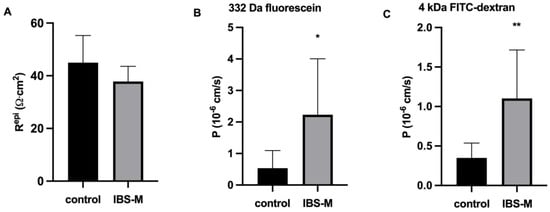 Epithelial resistance and colonic permeability for macromolecules in IBS-M. (A) Epithelial barrier function. In miniaturized impedance Ussing chamber for measuring small endoscopic colon biopsies, transmural electrical resistance, subepithelial resistance, and epithelial resistance (Repi) were discriminated by alternate current impedance spectroscopy. Repi was not reduced in patients with IBS-M. Controls: n = 11; IBS-M: n = 7; n.s. (B) For IBS-M (n = 7; * p < 0.05), 332 Da fluorescein showed increased permeability compared with control (n = 10). (C) FITC-dextran-4000 (4 kDa), IBS-M (n = 8; ** p < 0.01) showed increased permeability compared with control (n = 8). Statistical comparison was performed using Student’s t-test for unpaired samples. Data represent mean ± SD.