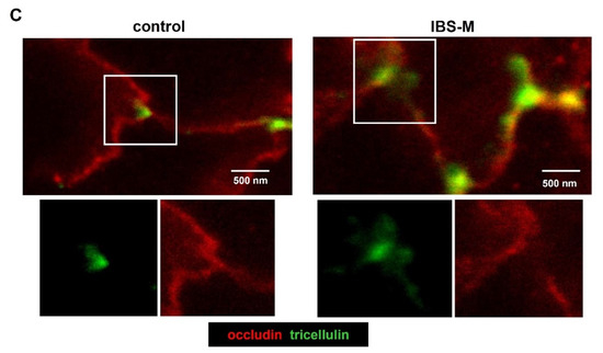 In addition to the quantitative determination of TJ proteins in the Western blot, we determined the subcellular localization of strand-forming TJ proteins to identify whether a change in distribution with a consequent loss of a TJ protein from the TJ strands could contribute to the epithelial barrier impairment. Therefore, immune-stained tissue sections were examined by confocal laser-scanning microscopy. Interestingly, a significant alteration in tricellulin localization was detected as the most important finding, namely a redistribution off the tTJ (Figure 5A), where it is important for tightening against a passage of macromolecules. This is supported by intensity plots comparing tricellulin immunofluorescence in tricellular and bicellular epithelial TJs (Figure 5A,B). Furthermore, confocal microscopy analysis of tricellulin and ZO-1 showed less co-localization in IBS-M compared to the control. In addition, a decrease in microscopic occludin fluorescence intensity signal was observed in IBS-M compared to the control, corresponding to the reduced expression of occludin in Western blots. With super-resolution STED microscopy, it was possible to visualize the delocalization of tricellulin away from the tTJ in IBS-M (Figure 5C).