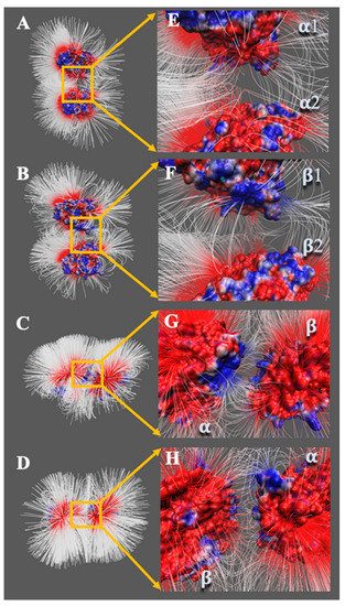 Electric field lines at the interfaces of interacting tubulins (α/α, β/β, α/β, β/α). The whole view of electric field lines of (A) α/α tubulin complex, (B) β/β tubulin complex, (C) α/β tubulin complex, and (D) β/α tubulin complex. (E–H) are the close-up views of (A–D), respectively.