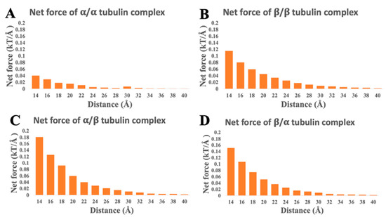 Electrostatic forces of tubulin/tubulin complexes were calculated by DelPhiForce [46,47] (as shown in Figure 4 and Figure 5). Arrows in Figure 4 are illustrated to visualize the net forces acting on a selected tubulin when it is shifted away from the other tubulin at distances ranging from 14 Å to 40 Å with a step size of 2 Å. The arrow directions indicate the net force directions. Figure 4 shows that β/β, α/β, and β/α complexes have attractive forces at distances ranging from 14 Å to 40 Å because the overall direction trends are attractive. For the α/α tubulin complex, the overall trend of the blue arrows is repulsive. Thus, the interaction between α tubulin and α tubulin is repulsive, which is consistent with our electrostatic potential results. To illustrate the directions clearly, the sizes of the arrows in Figure 4 do not indicate the magnitudes of the forces. The magnitudes of the forces are shown in Figure 5.