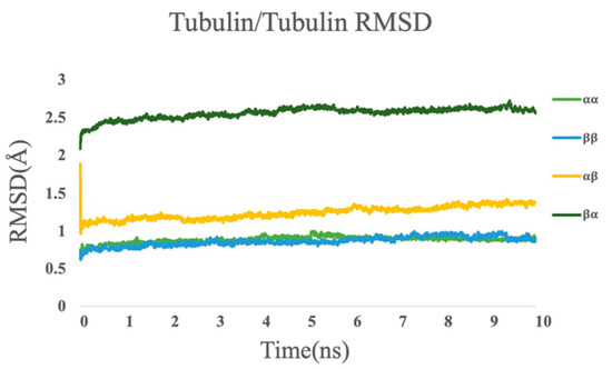 A 10 ns simulation was performed for each of the tubulin/tubulin complexes. The RMSD plot for each simulation is shown in Figure 6. The last 5 ns of the simulations were selected for analysis because their structures are stable as shown in the RMSD plot (Figure 6). The simulations were visualized by VMD [45] (shown in Movies S1–S4).