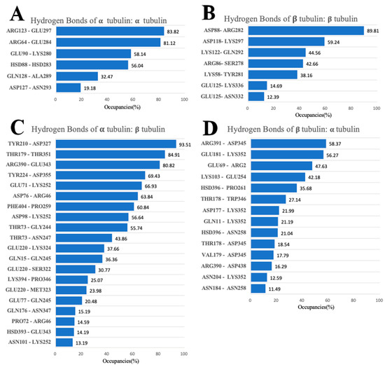 Hydrogen bonds at the interfaces of α/α, β/β, α/β, and β/α tubulin complexes with their occupancies. (A) α/α tubulin complex. (B) β/β tubulin complex. (C) α/β tubulin complex. (D) β/α tubulin complex.