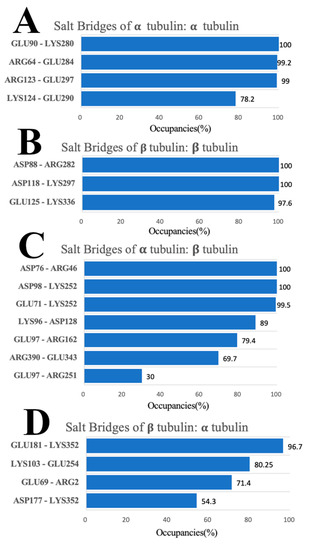 Salt bridges for α/α, β/β, α/β, and β/α tubulin-tubulin complexes with their occupancies. (A) α/α tubulin complex. (B) β/β tubulin complex. (C) α/β tubulin complex. (D) β/α tubulin complex.