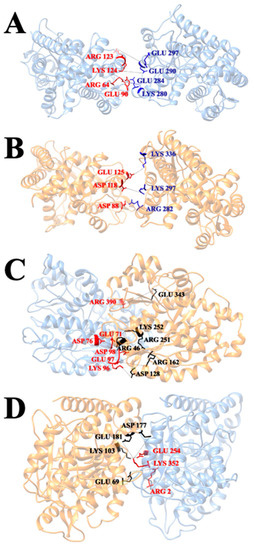 In our analysis, the salt bridges and hydrogen bonds which were rarely formed (<10% occupancy) were ignored. The residues involved in the hydrogen bonds and salt bridges > 10% occupancies were analyzed.