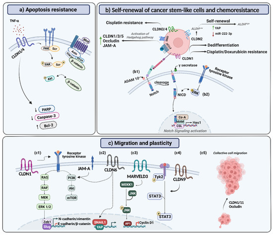 Schematic representation of examples of mechanisms mediated by members of the tight junction protein family during carcinogenesis. (a) Tight junction proteins are identified as potential mediators of apoptosis/anikiosis resistance. This is mainly mediated through the upregulation of caspase-3, PARP and Bcl-2, in parallel to the modulation of Src and Akt phosphorylation, coupled to β-catenin overexpression. (b) Tight junction proteins are also potential mediators of cancer stem-like phenotype acquisition, where they contribute to self-renewal and dedifferentiation, as well as therapeutic resistance and poor prognosis. In this setting, CLDN1 overexpression increases Notch signaling (b1), in parallel to the induction of MMP-9 expression and p-ERK signaling (b2), as well as through its non-canonical role in regulating Notch/PI3K/Wnt/β-cateninSer552 signaling. (c) Beside stemness, tight junction proteins are crucial regulators of cell migration and plasticity, where they activate key signaling pathways related to epithelial-to-mesenchymal transition (EMT). Indeed, CLDN1 was described to promote mesenchymal transformation by upregulating Slug and Zeb1 through the activation of the c-Abl-Ras-Raf-1-ERK1/2 signaling axis (c1). CLDN6 was also described to promote EMT by increasing YAP1 nuclear translocation and enhancing its interaction with Snail1 (c2), as well as through the activation of the PI3K/Akt pathway, along with JAM-A. MarvelD3 has been suggested to regulate migration through the JNK pathway (c3), and CLDN9 was shown to promote invasive cellular behavior by activating the Tyk2/STAT3 signaling pathway (c4). TJ proteins were also described to promote collective cell migration (c5). ALDH: aldehyde dehydrogenase; CLDN: claudin; JAM: junction adhesion molecule; NCID: Notch intracellular domain; PARP: poly (ADP-ribose) polymerase; TNF-α: tumor necrosis factor-alpha.