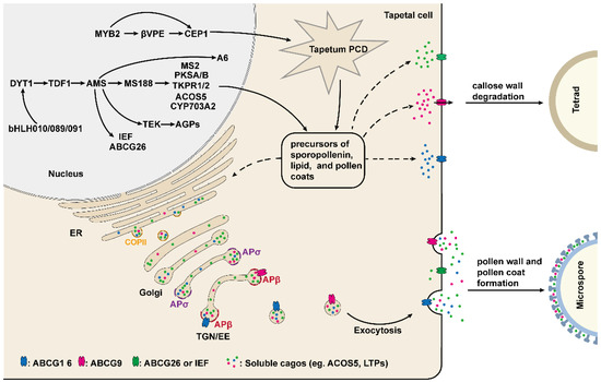 The underlying molecular mechanism of tapetum-mediated pollen development. The development and function of the tapetum are mainly regulated by a series of transcription factors. These transcription factors regulate the expression of genes required for the production of enzymes, transporters, and the precursors of sporopollenin, lipids, and pollen coats, which are indispensable for callose wall degradation, microspore development, and pollen wall and pollen coat formation. The secretion of these materials and precursors from tapetum cells to the anther locule is dependent on COPII and AP-mediated vesicle trafficking pathway.