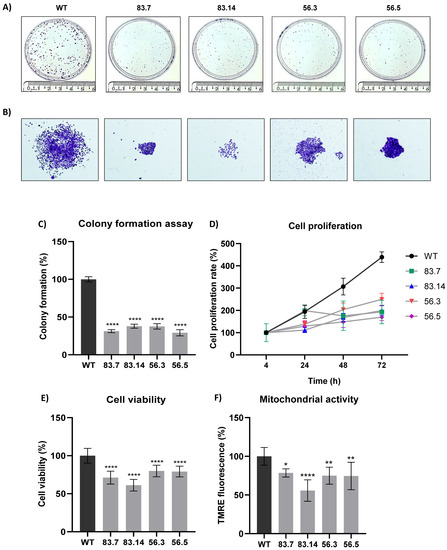 Malignant tumor cells can survive and grow without their neighboring cells and anchorage to the extracellular matrix (ECM) [43]. Therefore, we evaluated the clonogenic potential of NEK6-KO cell lines in the colony formation assay (Figure 2A). NEK6-KO cells exhibited a reduction in clonogenic potential. We also observed a decrease in the cell spread in NEK6-KO compared to WT colonies (Figure 2B), which may be related to a reduction in migration capacity. Quantification of the colony numbers was also manually performed, and the statistical analysis was shown (Figure 2C). We evaluated the proliferation rates of WT and NEK6-KO cell lines for 4, 24, 48, and 72 h (Figure 2D). All NEK6-KO cell lines, at 48 and 72 h, showed a significant decrease in proliferation: for 48 h (WT vs. 83.7 **, WT vs. 83.14 ***, WT vs. 56.3 **, and WT vs. 56.5 ***) and for 72 h (WT vs. 83.7 ****, WT vs. 83.14 ****, WT vs. 56.3 ****, and WT vs. 56.5 ****), with * p < 0.05, ** p < 0.01, *** p < 0.001, and **** p < 0.0001. The cells were maintained in the culture until reaching 100% cell confluence, and the MTT assay was performed to evaluate the cell viability (Figure 2E). We found that NEK6-KO cells presented a lower viability than WT cells, suggesting that mitochondrial activity may be downregulated in NEK6-KO cells. We stained the cells with TMRE to measure the mitochondrial membrane potential (Figure 2F) to prove this hypothesis. NEK6-KO cells demonstrated a diminished mitochondrial membrane potential, suggesting that NEK6 depletion alters the mitochondrial activity and viability.