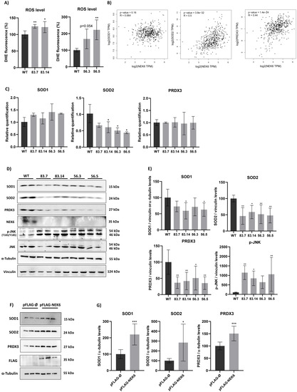 Therefore, we evaluated the SOD1, SOD2, and PRDX3 expression at mRNA levels in WT and NEK6-KO cells by RT-qPCR (Figure 3C). The expression of SOD2 was significantly diminished at transcriptional levels in NEK6-KO cells; however, we did not observed any statistical difference in the SOD1 and PRDX3 mRNA levels. SOD1, SOD2, and PRDX3 protein expression were also evaluated by Western blotting (Figure 3D). A significantly reduced protein expression of SOD2 and PRDX3 was observed in all NEK6-KO cell lines, and a reduction of SOD1 expression was noted in 83.14 and 56.5 NEK6-KO cells lines, suggesting that increased ROS levels may be related to a lack of antioxidant defenses, such as SOD1, SOD2, and PRXD3. ROS also promotes the activation of c-Jun N-terminal kinase (JNK), a protein activated by a wide range of cellular stresses [48]. Then, we also evaluated the phosphorylation levels of JNK (T183/Y185), which revealed a statistically significant increase in its phosphorylation in NEK6-KO cells (Figure 3D,E). We also overexpressed FLAG-NEK6 in DU-145 WT cells and evaluated the SOD1, SOD2, and PRDX3 protein levels (Figure 3F). These antioxidant proteins had a statistically significant higher protein expression in NEK6 overexpression DU-145 cells, revealing that NEK6 regulates the antioxidant system through the SOD1, SOD2, and PRDX3 levels (Figure 3G). Here, we suggest that NEK6-KO cells showed higher oxidative stress, since a NEK6 lack causes a reduction in antioxidant defenses, which may be involved with the decrease in cell viability and mitochondria activity.