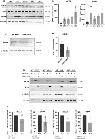 ROS are well known as mediators of DNA damage. Ataxia–telangiectasia mutated (ATM) is a sensor kinase of a double-stranded break (DSB), followed by a signaling cascade that culminates in the phosphorylation of histone H2AX [30]. ATM is directly activated by oxidative stress, leading to its autophosphorylation in serine 1981 [49]. Since NEK6 is involved in the cell redox balance, we explored whether NEK6 could be related to the DNA damage response. We analyzed the phosphorylation levels of ATM and H2AX in WT and NEK6-KO cells (Figure 4A,B). Western blotting confirmed that the levels of ATM phosphorylation in serine 1981 and γH2AX were increased in NEK6-KO cells compared to WT cells, suggesting NEK6 is involved in DDR. We confirmed this result by overexpressing NEK6 in WT cells, revealing that NEK6-overexpressing cells presented lower levels of γH2AX (Figure 4C,D). Additionally, we performed the rescue assay by overexpressing NEK6 in all NEK6-KO cell lines and observed that H2AX recovered its phosphorylation (Figure 4E,F). These results indicated that NEK6 regulates DDR pathways, which may be related to the reduction in viability, proliferation, and alteration in the redox balance in NEK6-KO cells (Figure 2 and Figure 3).