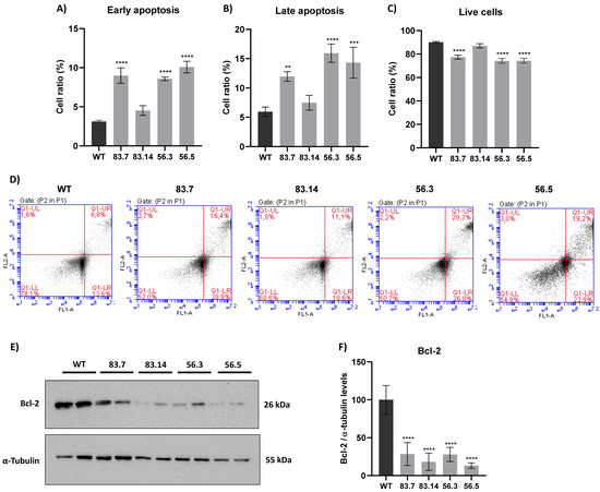 ROS can activate several signaling pathways that can trigger the process of cell death [25]. One of them is the activation of JNK kinase, leading to apoptosis [50]. We already demonstrated in Figure 3 that NEK6-KO cells presented higher levels of JNK phosphorylation. Furthermore, significant alterations in the DNA damage response, redox balance, and mitochondrial membrane potential were shown in NEK6-KO cells. For this reason, we hypothesized that the loss of NEK6 expression could lead to cellular apoptosis. Therefore, WT and NEK6-KO cells were stained with annexin and propidium iodide and analyzed in flow cytometry, and the parameters such as early and late apoptosis and live cells were analyzed (Figure 5). The 83.7, 56.3, and 56.5 NEK6-KO cell lines showed higher levels of early and late apoptosis and reduced live cells (Figure 5A–D). Bcl-2, which plays an antiapoptotic role by regulating mitochondrial outer membrane permeabilization, was drastically reduced in the NEK6-KO cell lines (Figure 5E,F). The results suggest that elevated ROS levels and subsequent events in NEK6-KO cells may lead to cell death.
