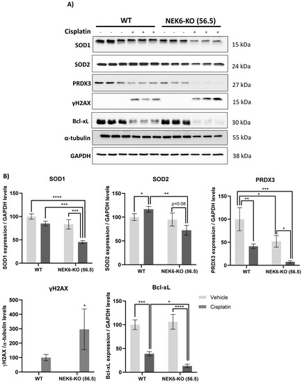 Cancer cells usually preserve a high basal level of ROS and are vulnerable to further increased ROS levels, exceeding a certain defensive threshold. Accordingly, ROS modulation has arisen as an anticancer strategy with the synthesis of various ROS-inducing or -responsive agents that target cancer cells [25,51]. It is known that exposure to cisplatin increases intracellular ROS and DNA damage, leading to apoptosis [52,53]. Considering that NEK6-KO cells have elevated basal levels of ROS, we treated these cells with cisplatin, an agent that induces ROS and DNA damage (Figure 6). We observed that the antioxidant defenses (SOD1, SOD2, and PRDX3); apoptosis marker (Bcl-xL); and DNA damage response (γH2AX) were altered in WT and NEK6-KO cisplatin-treated cells. We further identified that WT cells treated with cisplatin reduce SOD1 and PRDX3 expression. However, the NEK6-KO cells had a pronounced reduction in SOD1 and PRDX3 expression in the presence of cisplatin compared to the WT cells. Additionally, WT cells treated with cisplatin increased the SOD2 expression, while NEK6-KO had the opposite effect, diminishing the SOD2 expression. Additionally, we also observed that cisplatin treatment in the NEK6-KO cells strongly reduced Bcl-xL expression and increased γH2AX in comparison to the WT cells. These results indicate that the lack of NEK6 sensitizes DU-145 cells to cisplatin through a significant reduction in antioxidant defenses, the induction of DNA damage, and apoptosis.