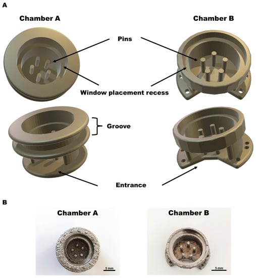 We developed two different chamber designs: design A and design B. The chambers were made of titanium (Ti) alloy powder titanium–6aluminum–4vanadium (Ti-6Al-4V, TEKNA Advanced Materials Inc., Sherbrooke, QC, Canada). The 3D fabrication process of the chambers was carried out at the Department of Materials Science and Engineering for Metals, FAU, Erlangen using selective electron beam melting (SEBM). The resulting 3D objects were further processed using a Computer Numerical Control (CNC) mill.